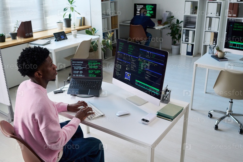 Молодой чернокожий человек кодирует на компьютере в офисе с несколькими мониторами