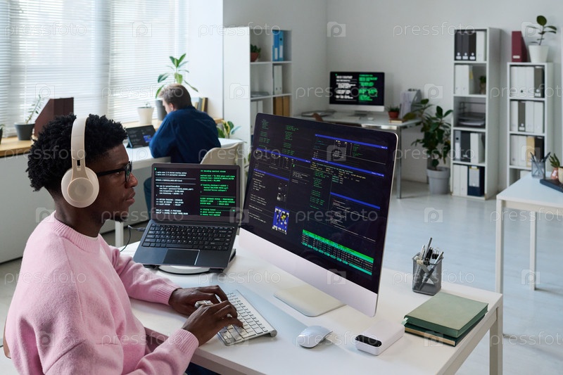 Молодой чернокожий человек программирует программное обеспечение на компьютере в офисной рабочей зоне