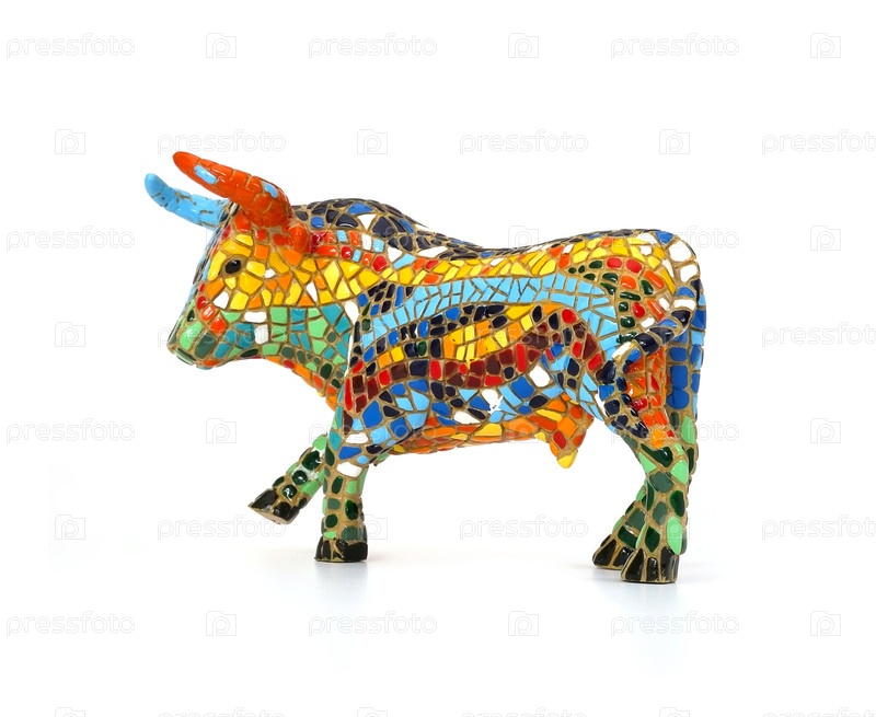 Сувенирная мозаичная фигура быка в Испании изолирована на белом фоне