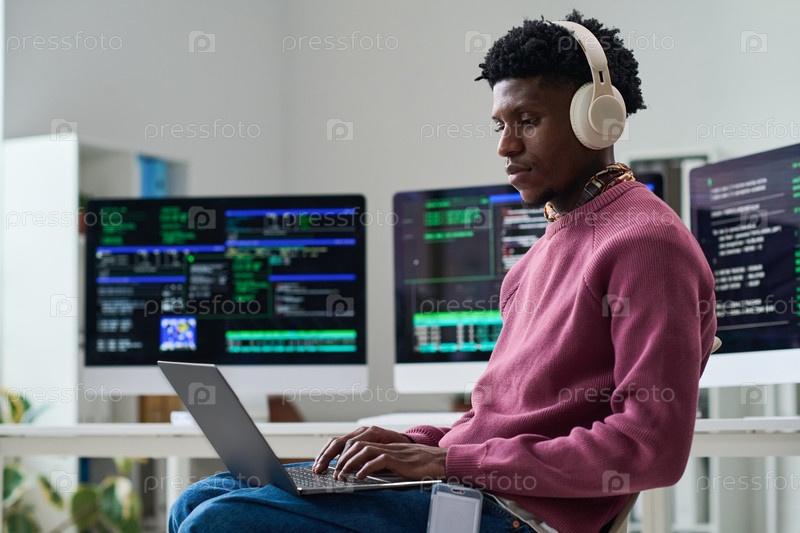 Молодой чернокожий мужчина с наушниками работает на ноутбуке в офисе