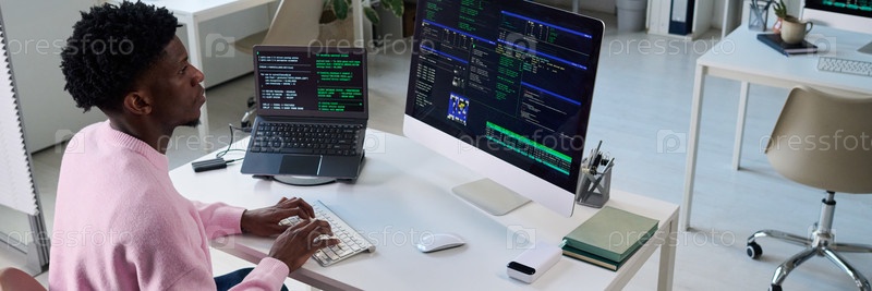 Молодой чернокожий человек программирует программное обеспечение на компьютере и ноутбуке в офисе