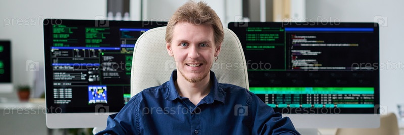 Портрет молодого человека, улыбающегося во время работы с компьютерными экранами