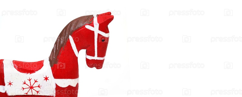 Красный конь (игрушка с рождественской елкой) изолирован на белом фоне