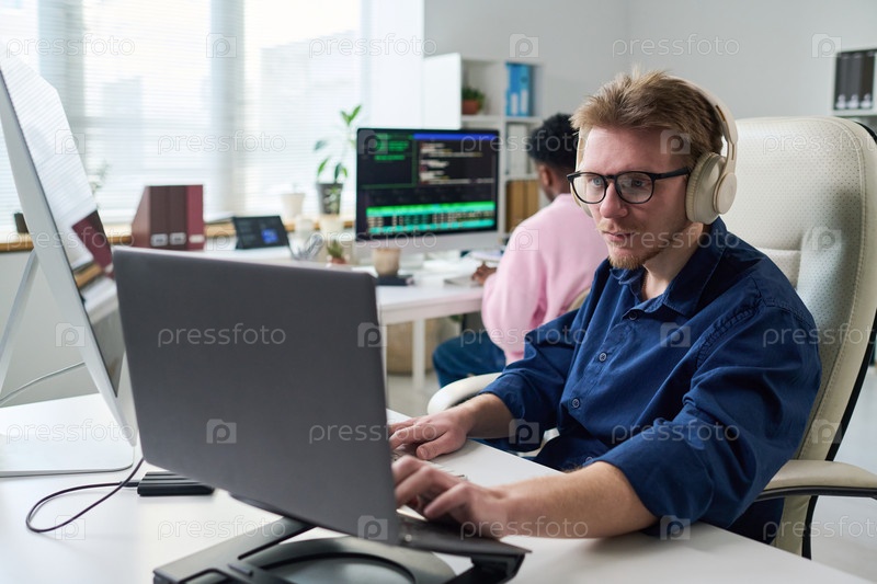 Молодой человек с наушниками работает на ноутбуке в офисе