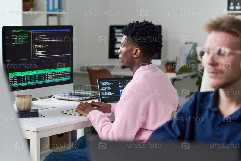 Черный человек отладки программного кода на настольном компьютере в офисе Young