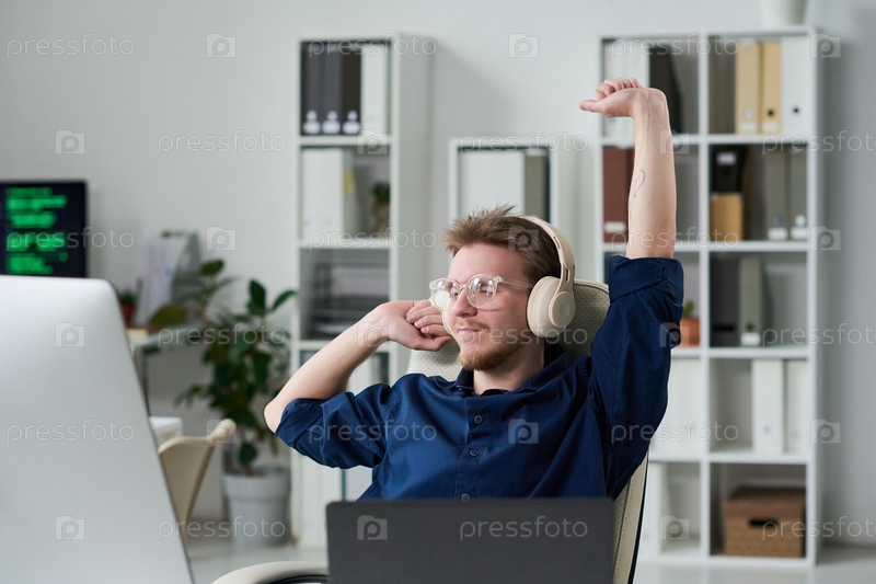 Молодой человек, носящий наушники, растягивается во время работы за столом