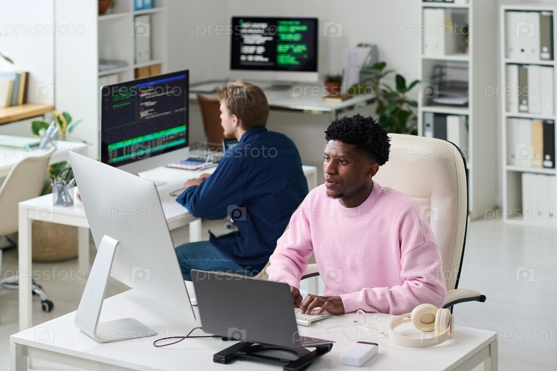 Молодой чернокожий человек сотрудничает с коллегой по разработке программного обеспечения