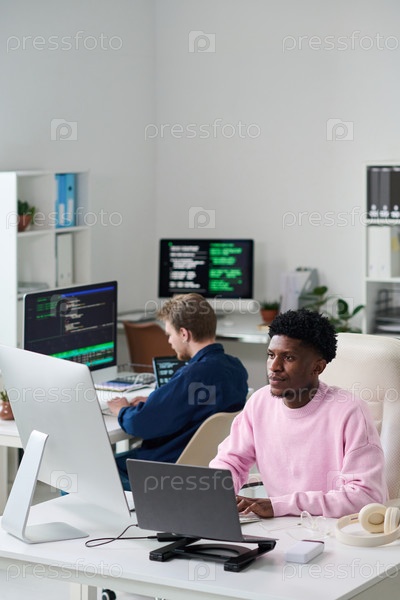 Молодой чернокожий мужчина работает на компьютере в офисе с коллегой, кодирующей