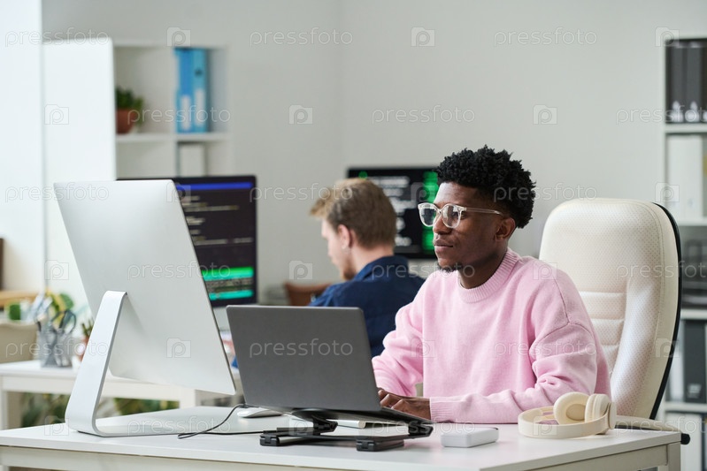 Молодой чернокожий мужчина сосредоточился на задачах по разработке программного обеспечения в офисе