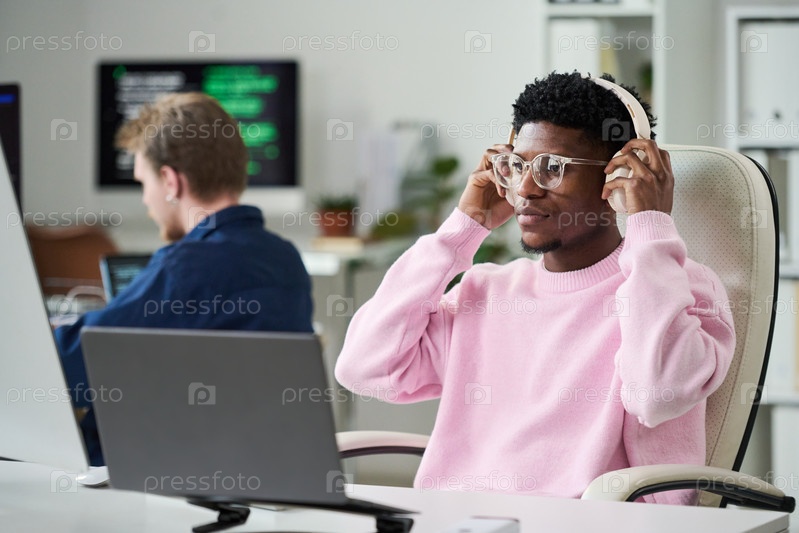 Молодой чернокожий мужчина с наушниками работает на компьютере в офисе