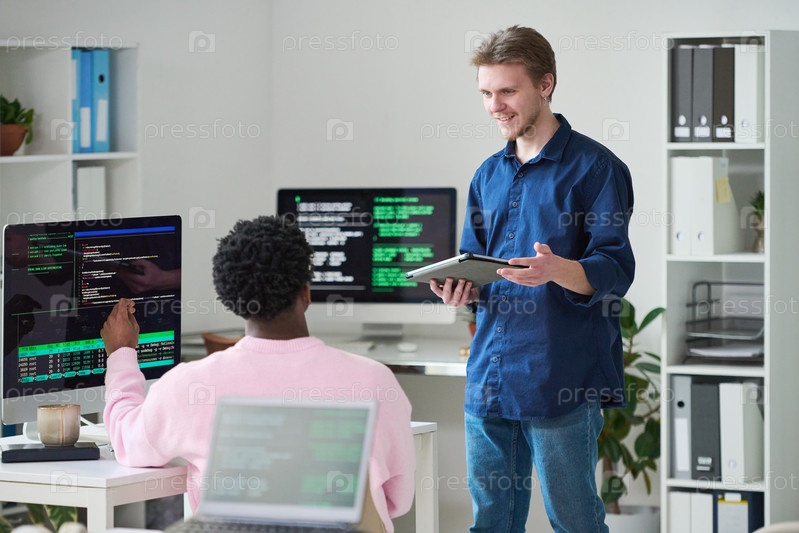 Молодой человек обсуждает проект с чернокожим коллегой в офисе