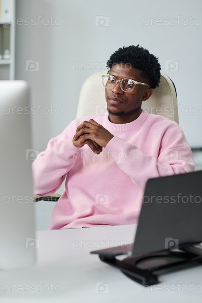 Молодой чернокожий мужчина сидит за рабочим столом с помощью компьютера и выглядит вдумчивым