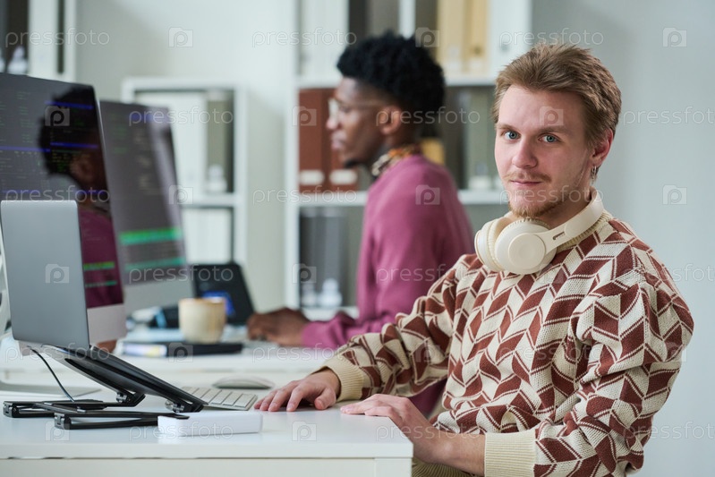 Портрет молодого человека, работающего на компьютере в офисе