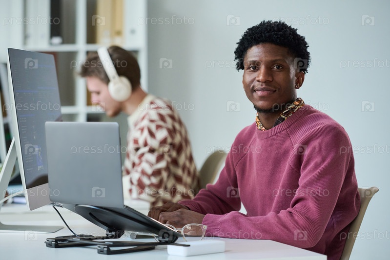 Портрет молодого чернокожего мужчины, улыбающегося, сидящего за рабочим столом