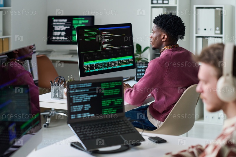 Молодой чернокожий человек просматривает программный код на нескольких компьютерных экранах