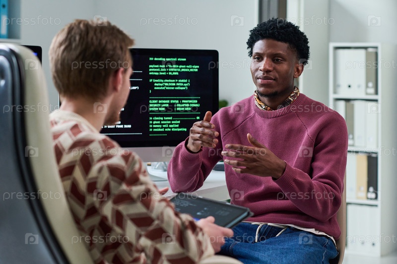 Молодой чернокожий человек объясняет коллеге концепции программного обеспечения
