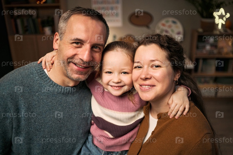 Портрет белого мужчины средних лет Женщина и молодая девушка улыбаются вместе