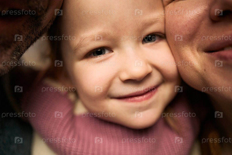 Портрет белого ребенка, улыбающегося во время объятий родителей в помещении