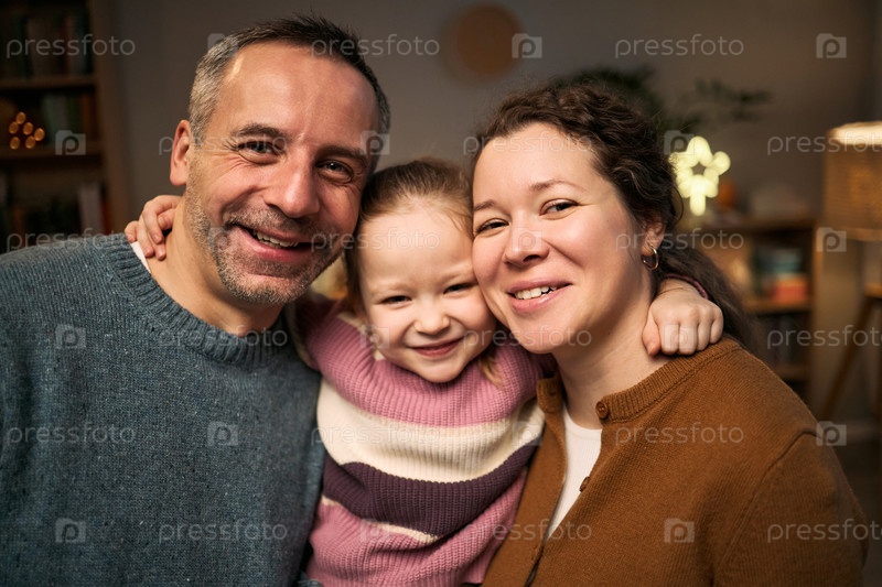 Портрет белого мужчины средних лет Женщина и молодая девушка улыбаются перед камерой
