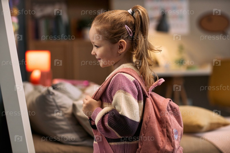 Кавказская девочка-ребенок улыбается, нося рюкзак в помещении перед школой