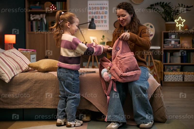 Кавказская женщина помогает молодой девушке упаковать рюкзак в уютную спальню