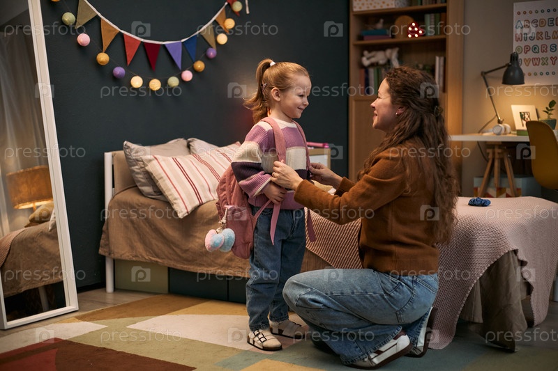 Кавказская мать помогает маленькой дочери готовиться к школе утром