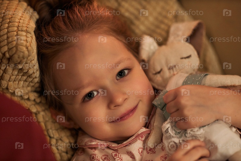 Портрет белокожей девочки-ребенка, улыбающейся во время объятий плюшевого игрушечного кролика