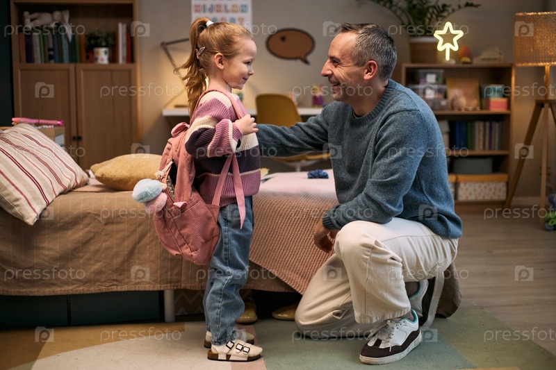 Кавказский мужчина средних лет улыбается, поощряя молодую девушку дома