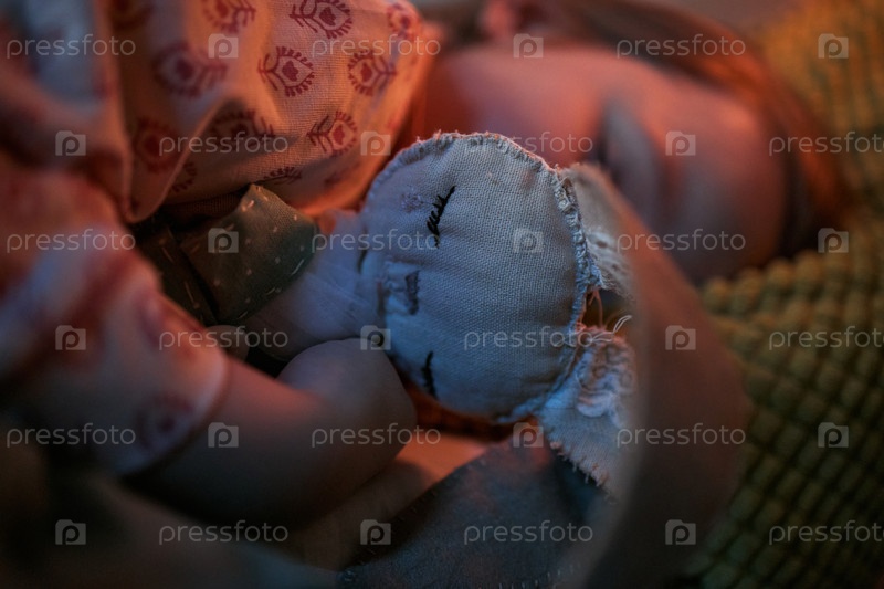 Кавказский ребенок спит спокойно, держа набитую игрушку для животных
