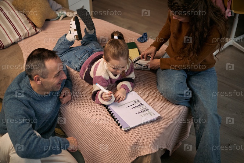 Кавказский мужчина с молодой девушкой и женщиной, сотрудничающими над домашним заданием