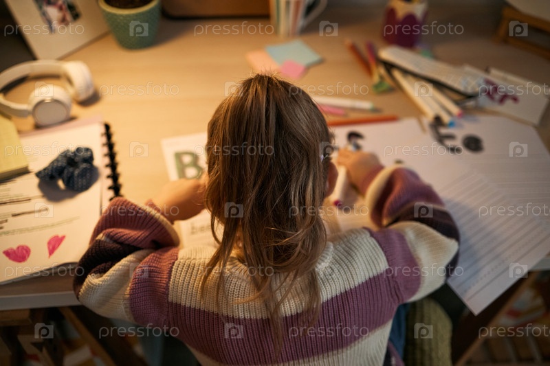 Кавказская девочка-ребенок изучает домашнее задание за столом в уютной домашней среде