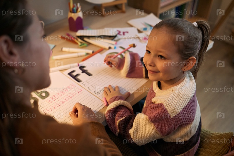 Кавказская девочка-ребенок практикует написание писем со взрослым во время домашнего задания