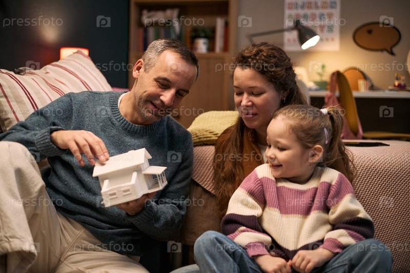 Кавказский мужчина средних лет играет с модельным домом возле Молодой женщины и ребенка