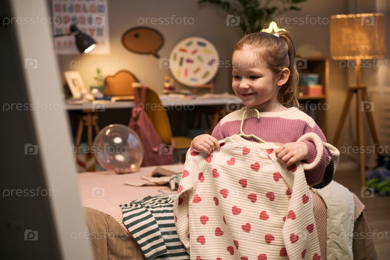 Кавказская девушка улыбается, держа рубашку с узором сердца в спальне
