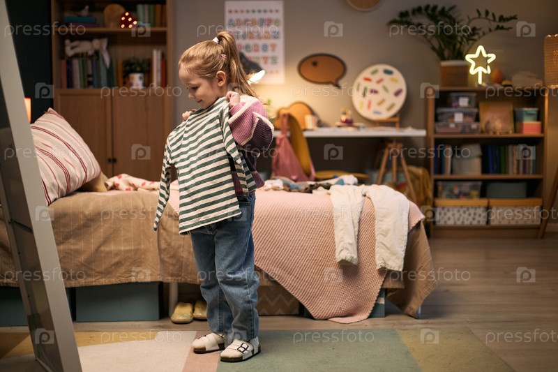 Кавказская девочка-ребенок выбирает наряд, стоя в уютной спальне