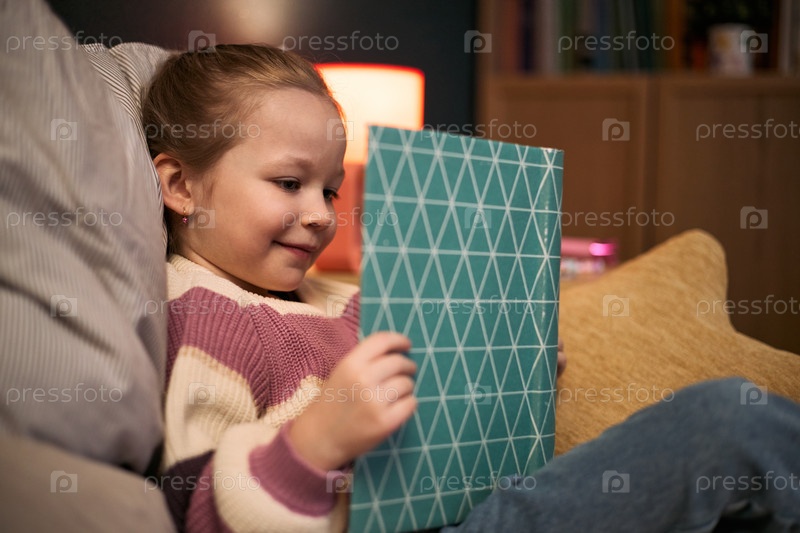 Кавказская девочка-ребенок улыбается, читая книгу В закрытом помещении вечером