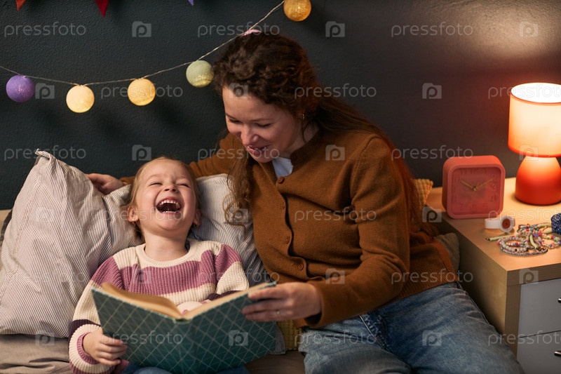 Кавказская женщина читает сказку от смешного ребенка в уютной комнате