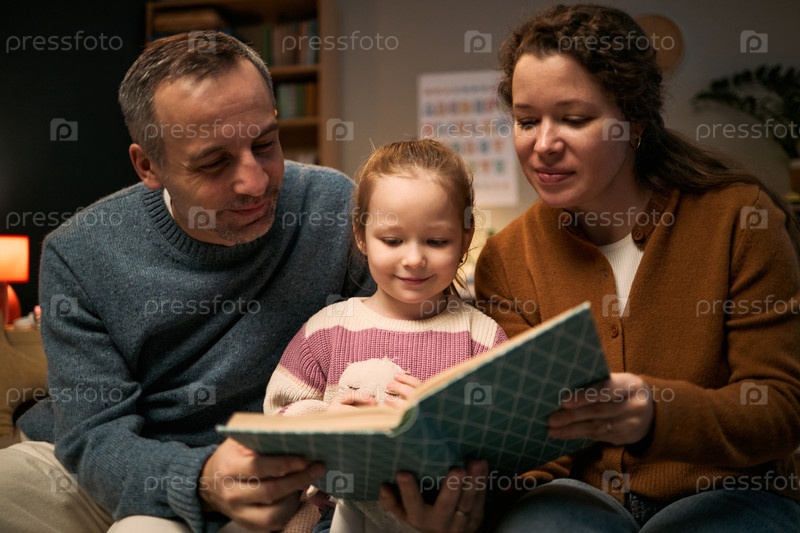 Кавказский мужчина среднего возраста и женщина читают рассказы с молодой девушкой