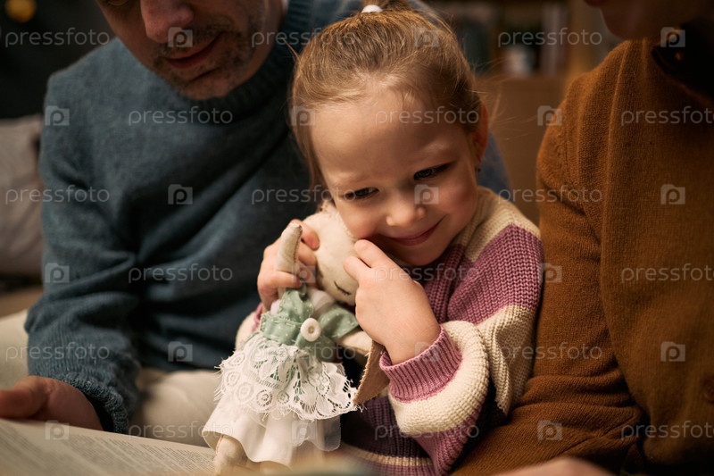 Кавказская девушка улыбается, держа набитую игрушку между родителями в помещении