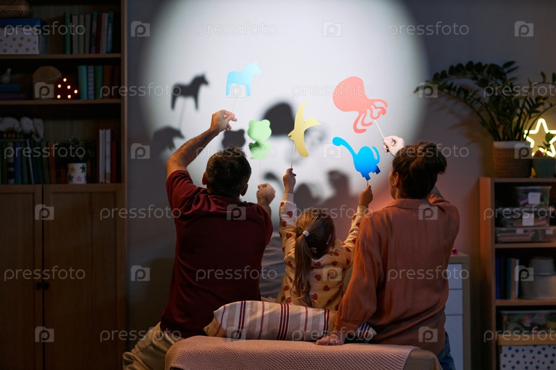 Кавказская семья с маленьким ребенком вместе создают тени животных на стене