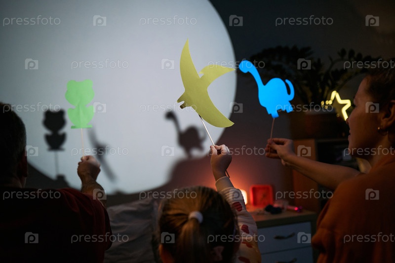 Кавказская семья создает теневые куклы животных во время вечернего игрового времени