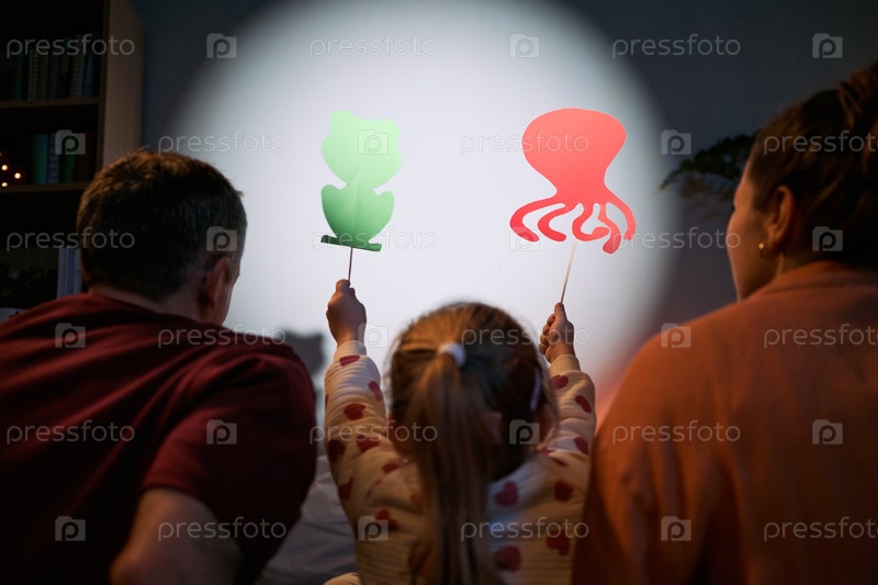 Кавказская семья смотрит, как молодая девушка вместе выступает в теневом кукольном шоу