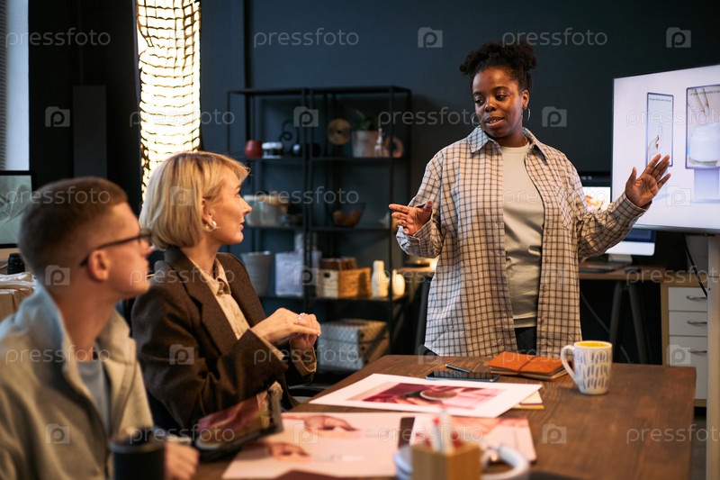 Молодая чернокожая женщина представляет творческий проект своим белым коллегам в офисе