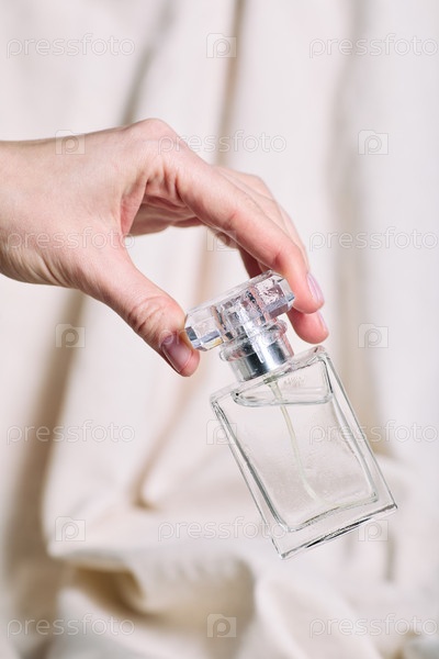 Кавказская женщина рукой держит прозрачную бутылку с парфюмом на нейтральном фоне