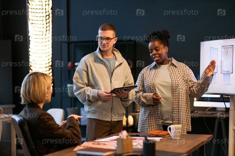 Юный кавказский мужчина и молодая чернокожая женщина представляют цифровой проект в офисе