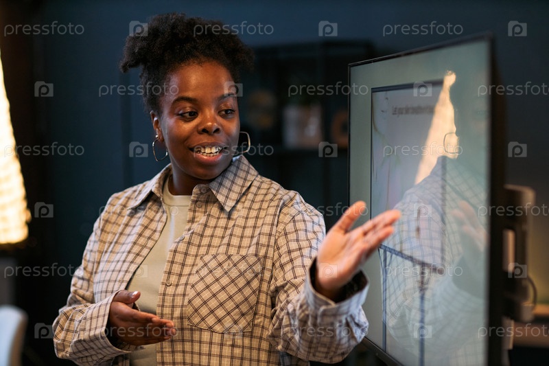 Молодая взрослая чернокожая женщина представляет дизайн баннера на цифровом экране во время деловой встречи