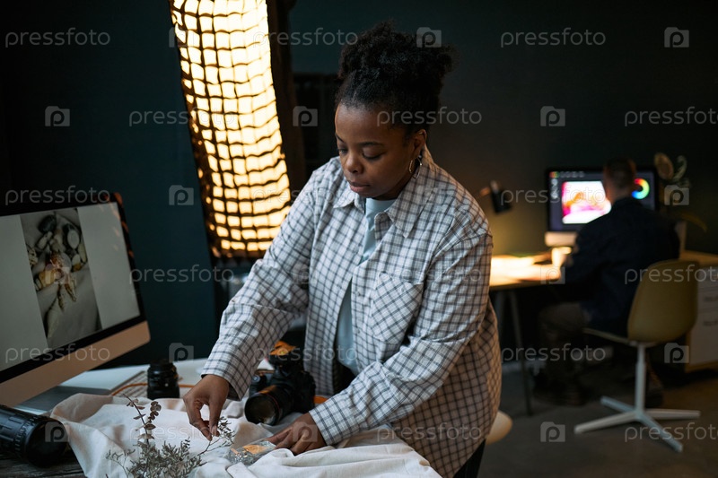 Молодая взрослая чернокожая женщина устраивает сушеные цветы во время профессиональной фотосессии