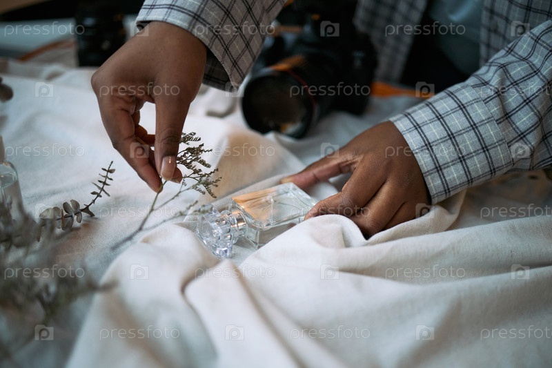 Молодая взрослая чернокожая женщина устраивает сухое растение рядом с бутылкой парфюмера в помещении