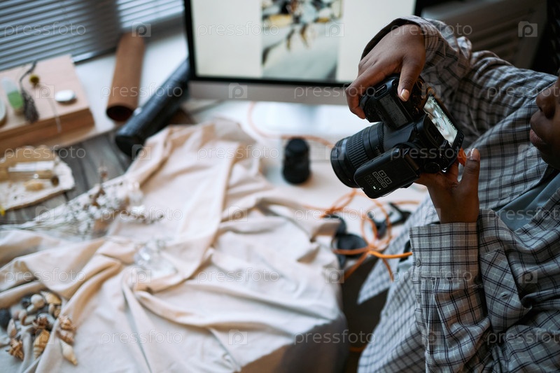 Молодая взрослая чернокожая женщина фотографирует натюрморт Композиция в студии