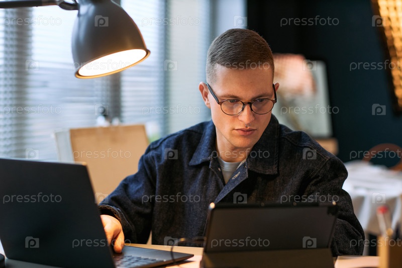 Кавказский молодой взрослый мужчина использует ноутбук и планшет во время работы в офисе
